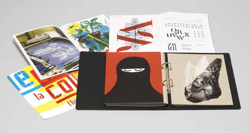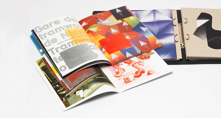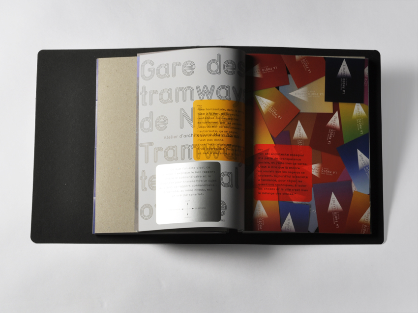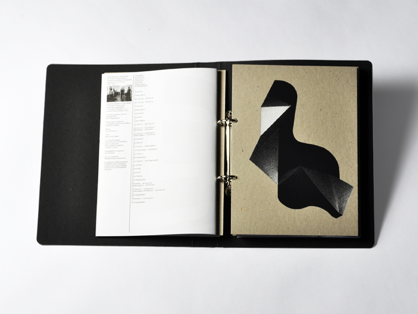 La deuxième édition du catalogue s’organise selon un concept différent du précédent : un classeur réunit plusieurs brochures dont la conception graphique a été laissée à chaque exposant. La seule contrainte donnée aux graphistes fut le choix et l’aspect de l’objet les rassemblant : un classeur en carton recyclé gris anthracite, des intercalaires sérigraphiés en blanc sur carton brut, un système de reliure « en boucle ».