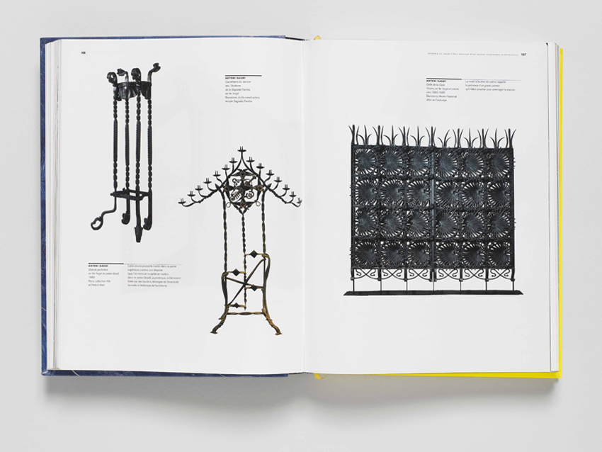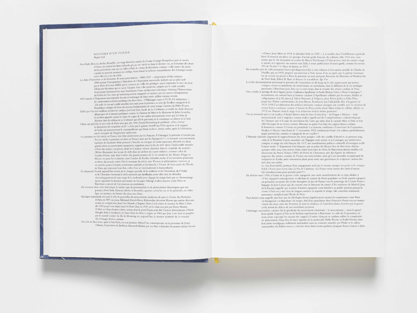 L’exposition « Paris-Barcelone" retrace l'histoire des liens artistiques et culturels entre ces deux villes, de la fin du XIXe siècle à la guerre civile espagnole. Le catalogue de l’exposition – dont le titrage et la ligne graphique ont été utilisés pour les affiches et documents de communication – s’inspire largement de l’expérimentation typographique propre aux Avant-Gardes catalanes. Dans l’ouvrage d’une grande richesse iconographique, le rapport du texte et des images met en évidence l’éclatante production d’œuvres d’art qui marqua le XXe siècle. Chaque ouverture de chapitre donne une clé de lecture sur la période annoncée. Traitées en à-plat noir, elles rythment l’ouvrage qui foisonne d’images colorées : un traitement chromatique passionnel, en somme.