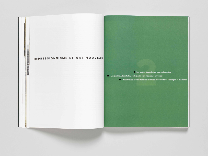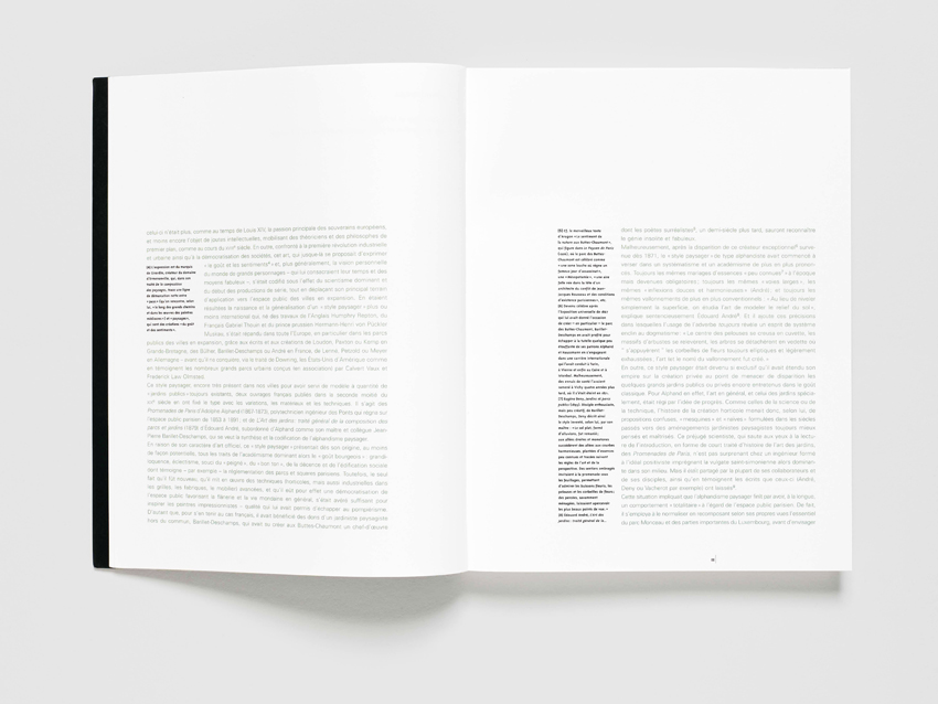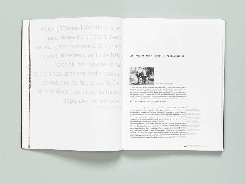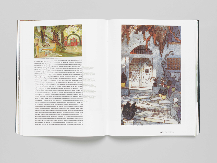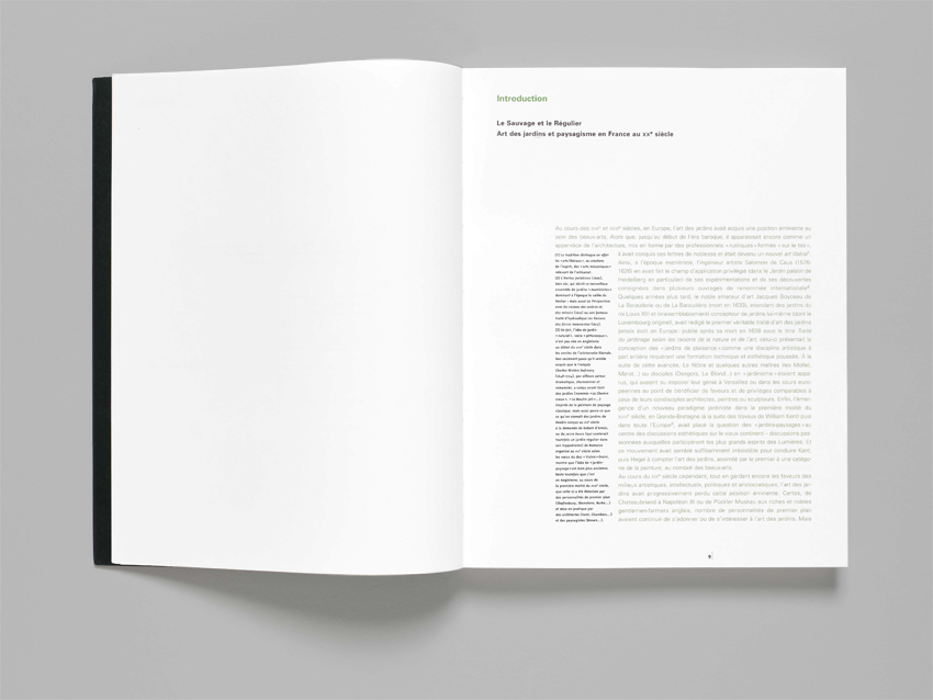 Le livre présente une synthèse inédite de l’art des jardins au XXe siècle. Premier à embrasser dans sa totalité cette histoire méconnue, il rend justice à un art réputé mineur, en le situant dans son contexte social, politique, économique, culturel et même international. La typographie, inspirée du vernaculaire, se déploie en deux couleurs au fil de l’ouvrage. Les notes, imprimées en vert, viennent se poser contre le texte de lecture, sans le perturber.