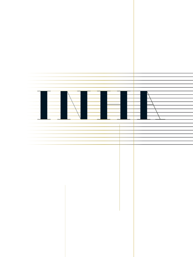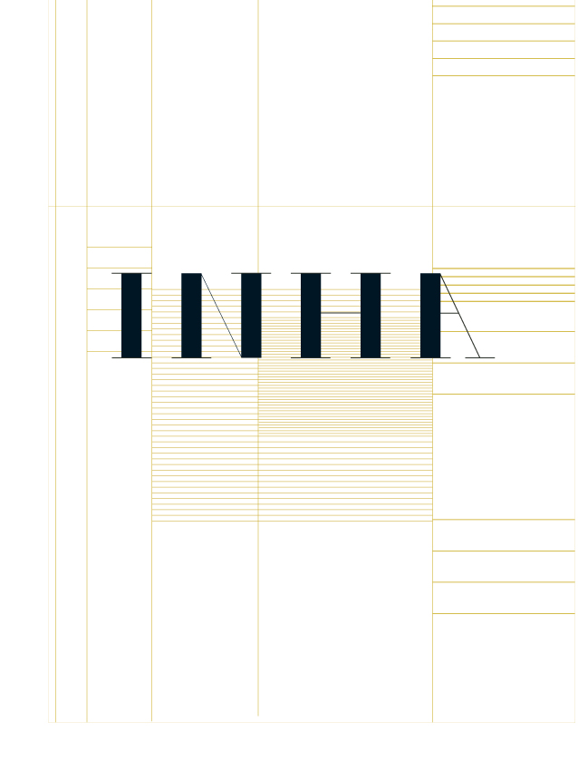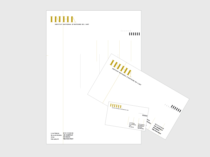 L’or est utilisé ici pour faire référence à l’Histoire de l’art. Le logotype est construit sur la base d’une Didone, une typographie qui fait écho aux colonnes de la Galerie Colbert, siège de l’INHA. Un système de lignage forme une trame qui apparait ou disparaît selon les documents. Ces lignes structurent délicatement la papeterie et envahissent plus ou moins les images, elles sont les éléments de syntaxe de l’identité. Concours classé 2e