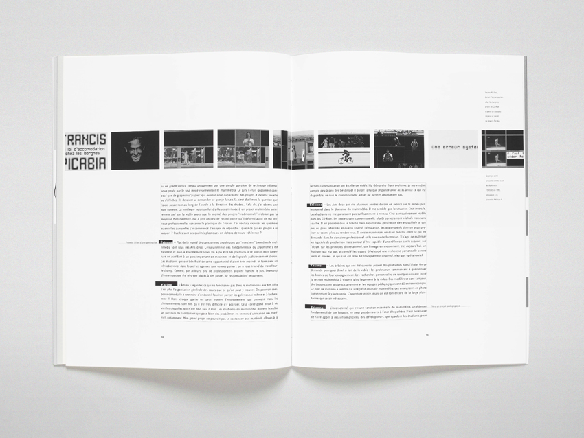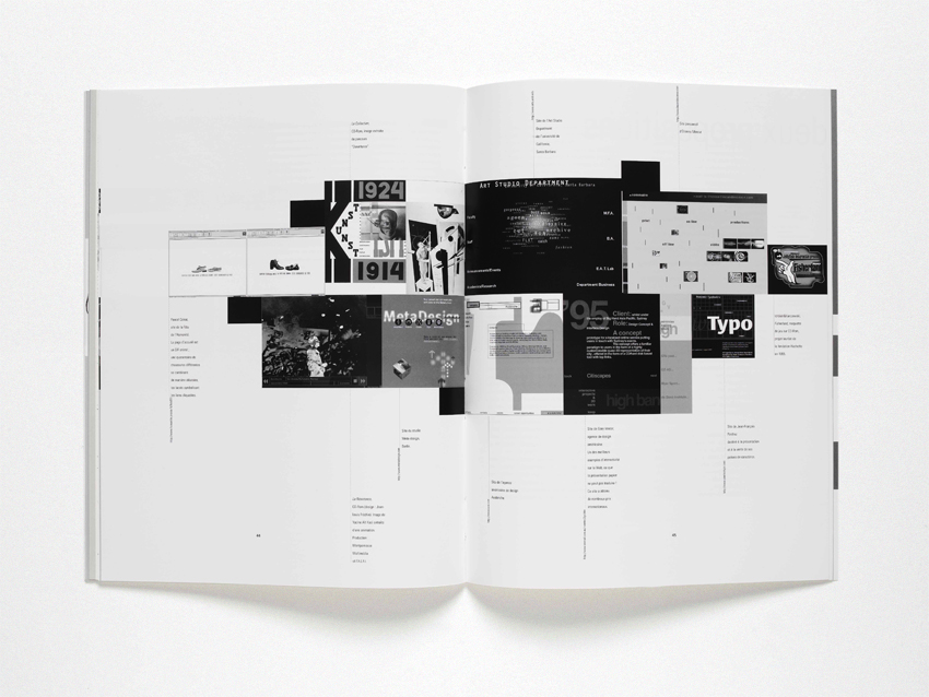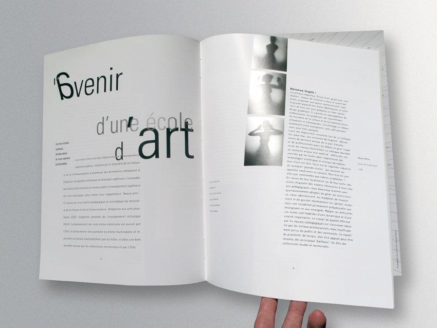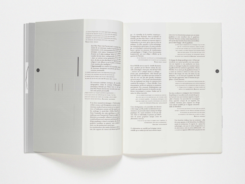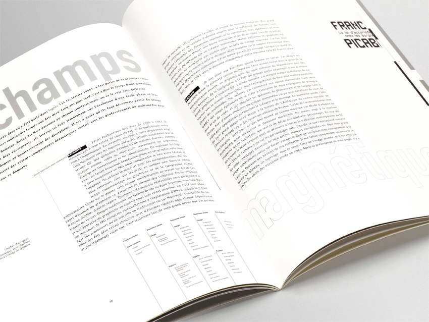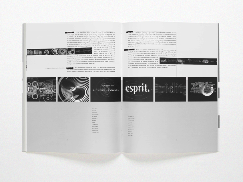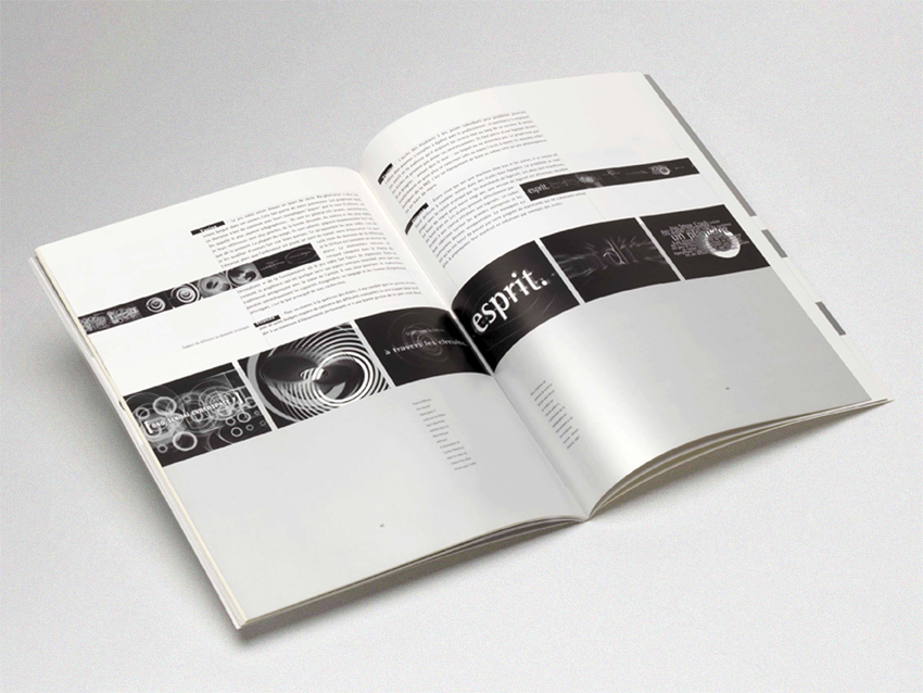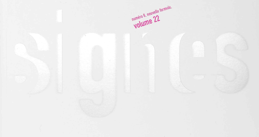 La revue « Signes » a longtemps été une publication culte dans le milieu du graphisme. Le principe de Michel Wlassikoff, fondateur et directeur de la revue, est simple mais exigeant : pour chaque numéro, un graphiste a carte blanche. Le numéro 22 me fut confié. La thématique centrale de la revue aborde dans ce numéro la question du multimedia et de son enseignement. Pour évoquer l’écran, un voile d’argent plus ou moins présent accompagne ici textes et images.