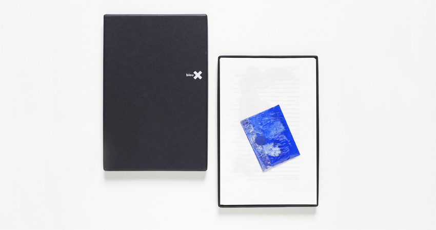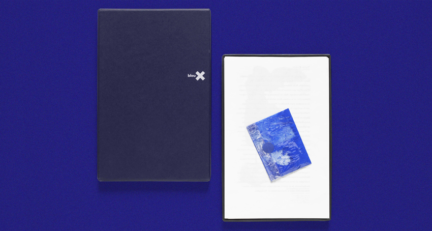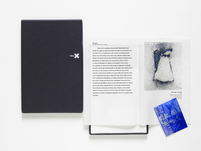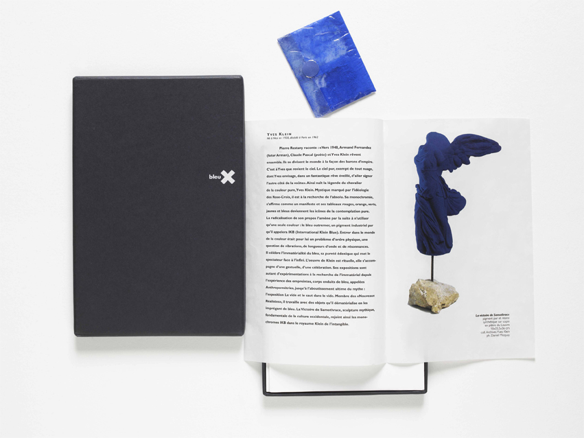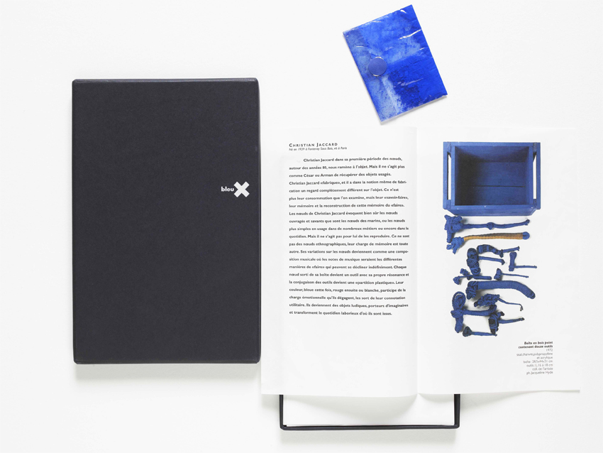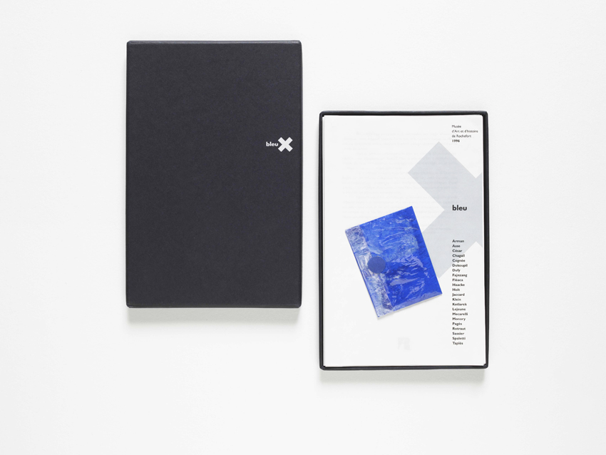 Le catalogue de l’exposition « Bleu » est un petit coffret plat bleu-marine, contenant une série de feuillets 4 pages en papier bible, qui présentent chacun un artiste de l’exposition. En ouvrant le coffret, on trouve un petit sachet de pigment bleu Klein sous cellophane.