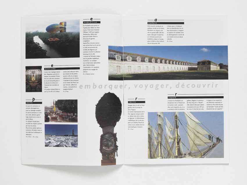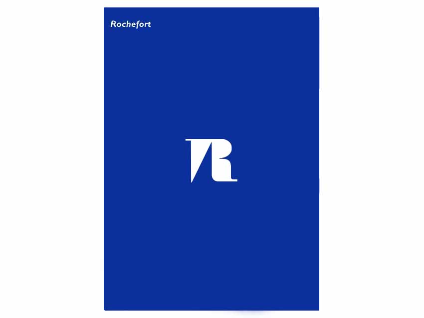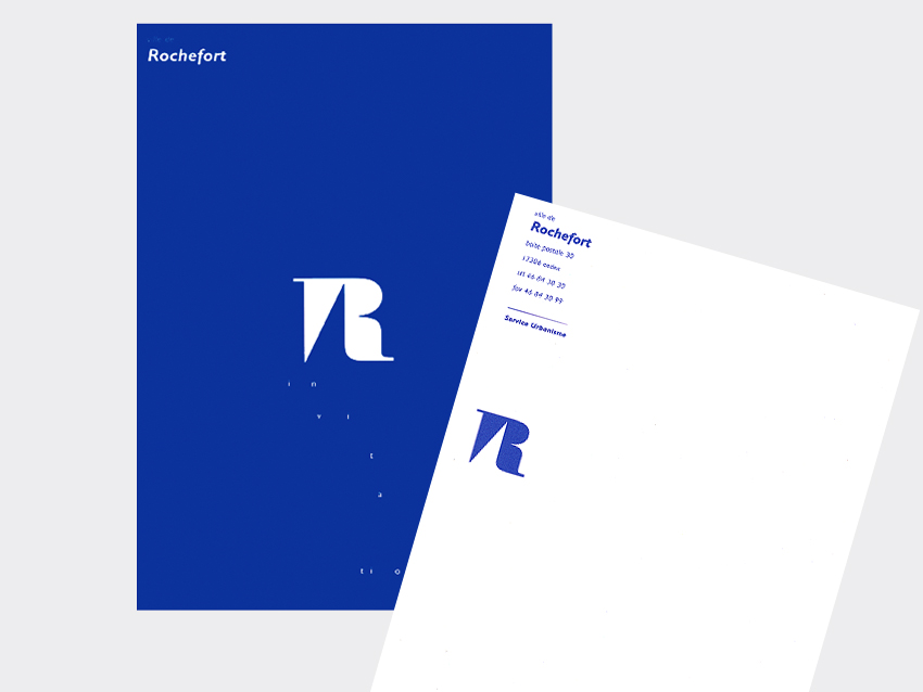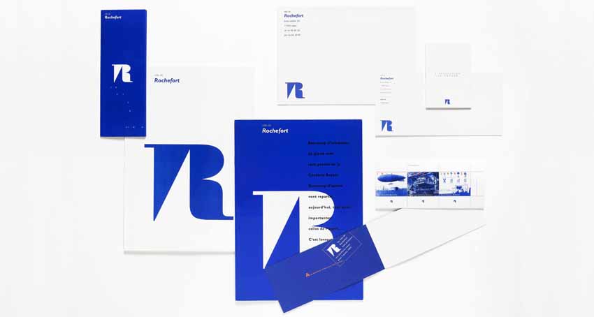 Le logo de la ville de Rochefort a été créé par Jean Widmer : la lettre « R », emblématique, est issue d’un un caractère « Didot » du XVIIe siècle qui correspond à la fondation de la ville par Colbert. En creux, une voile s’inscrit dans le logo. Le projet est ici le développement de l’identité et des supports de communication, ainsi que la création d’une charte graphique.