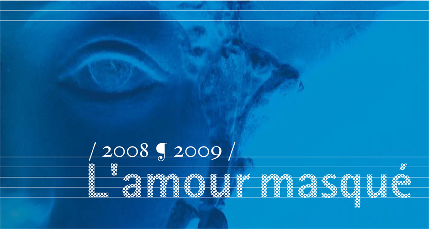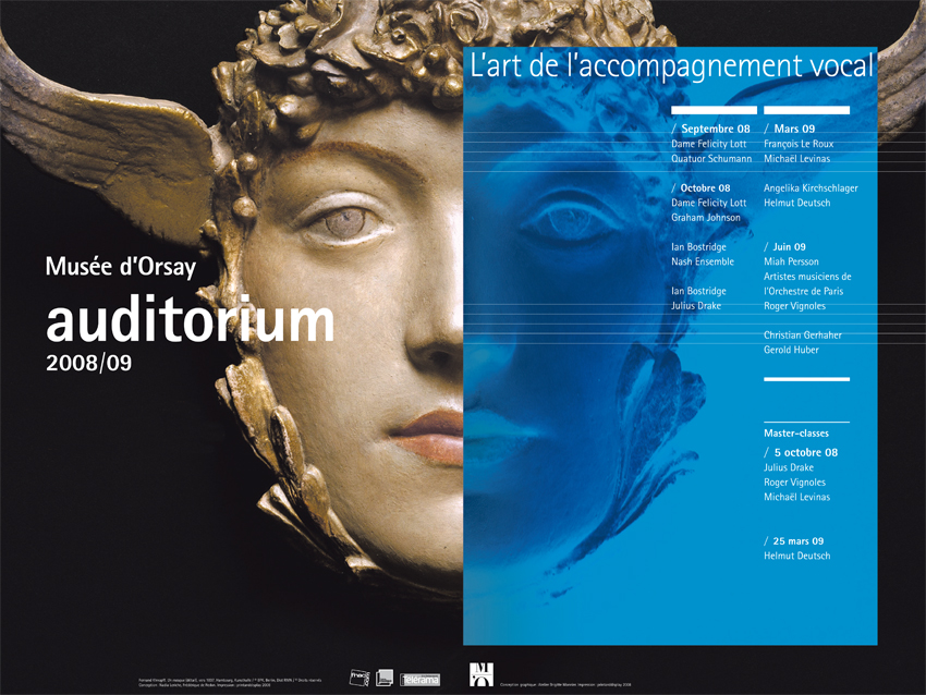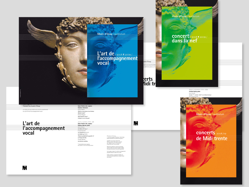 Des couleurs sensorielles ont été sélectionnées pour exalter l’identité musicale de l’Auditorium. Le principe graphique des affiches est de s’accorder avec le thème du moment, comme cette série, développée pour l’exposition « Masques », et pour les concerts qui y sont associés. Un simple jeu de lignage vient se poser sur le masque, « portant » la typographie, autre allusion à la portée de musique.